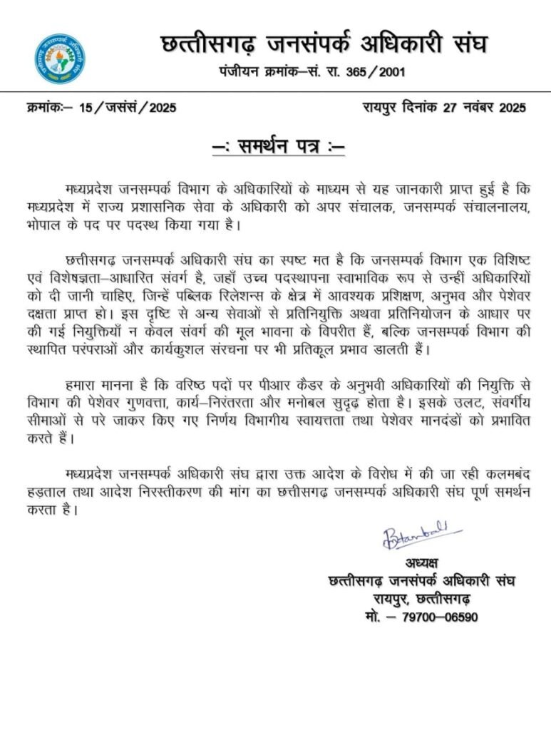 रायपुर, 27 नवंबर 2025/ छत्तीसगढ़ जनसम्पर्क अधिकारी संघ ने मध्यप्रदेश जनसम्पर्क विभाग में राज्य प्रशासनिक सेवा से की गई नियुक्ति के विरोध में मध्यप्रदेश के अधिकारियों-कर्मचारियों द्वारा उठाए गए कलमबंद हड़ताल के कदम को पूर्ण समर्थन प्रदान किया है।